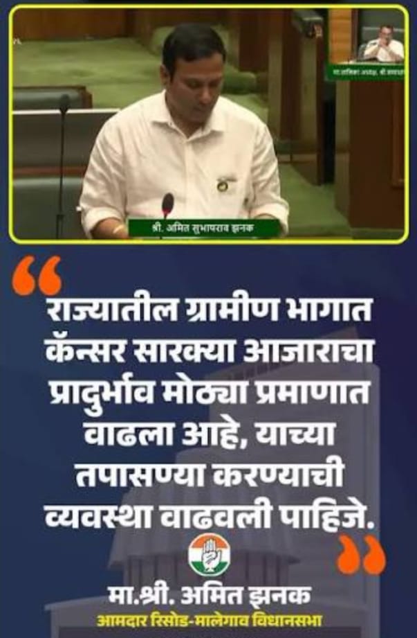 ही चर्चा मनात असतानाच महाराष्ट्र विधानसभेत कर्करोगाच्या वाढत्या संकटावर चर्चा झाली. रिसोड–मालेगावचे आमदार अमित सुभाषराव झनक यांनी ग्रामीण भागातील कर्करोग रुग्णांसाठी लवकर निदान व स्थानिक उपचार सुविधा वाढवण्याची ठाम मागणी केली.